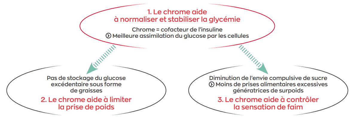 surpoids. Inversement, la supplémentation en chrome améliore la réponse à l’insuline, la glycémie et les lipides circulants. Cet oligoélément accompagne naturellement le régime amaigrissant et participe à la régulation de l’appétit et à la perte de poids. Une supplémentation semble raisonnable à hauteur de 200 µg, en tenant compte de la teneur en chrome de l’alimentation (les aliments raffinés comme la farine blanche et le sucre blanc n’en contiennent presque plus) et de certaines situations connues pour augmenter les besoins en chrome ou accélérer sa perte urinaire (grossesse, sport intense, stress, traumatisme physique, alimentation riche en sucres rapides)